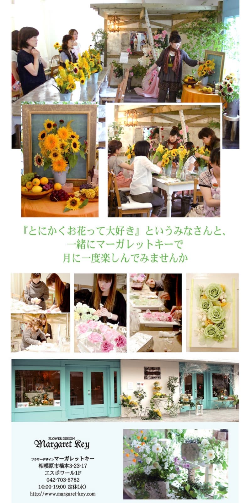 マーガレットキーのレッスンは資格や長さや角度などではなく、心を磨くところです。花に対する感覚や思いを持てれば感性は素晴らしく広がり、より充実した生活が出来ると思います。ぜひその感性をもって花を人に差し上げたり、人に発信したりしてください、きっとその人の感性も刺激されるはず。